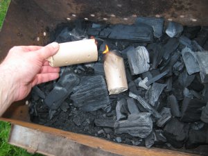 Кладем эти втулки рядом на землю и ждем некоторое время, пока они получше разгорятся.