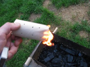 Держим втулку в руке еще несколько секунд, чтобы она получше разгорелась, а затем кладем ее на землю, на место будущего костра.