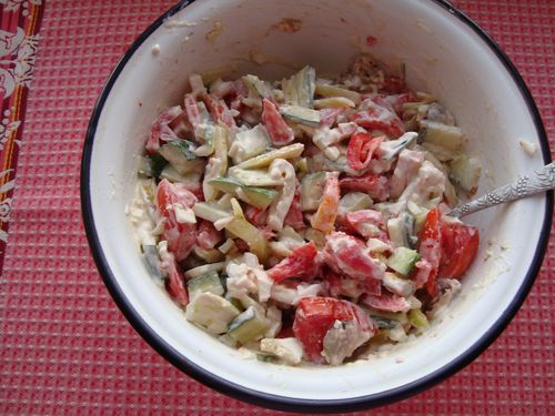 Сочетание сочных овощей и специфического вкуса морепродуктов дарят салату интересные оттенки. Такое блюдо может украсить праздничный стол или послужить отличным завтраком при ежедневной трапезе.