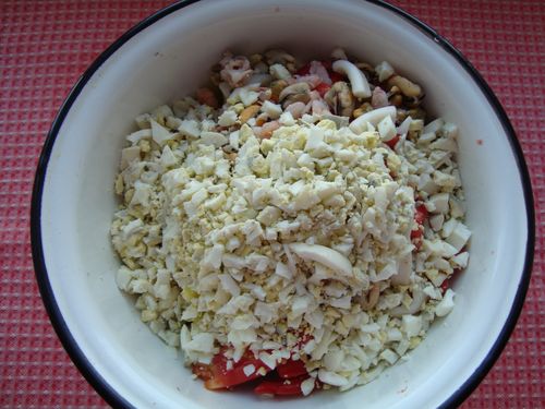 А вот яйца требуется хорошо измельчить, но ни в коем случае не трите их на терке, так как они тогда потеряют свой уникальный вкус и в салате будут незаметны.
