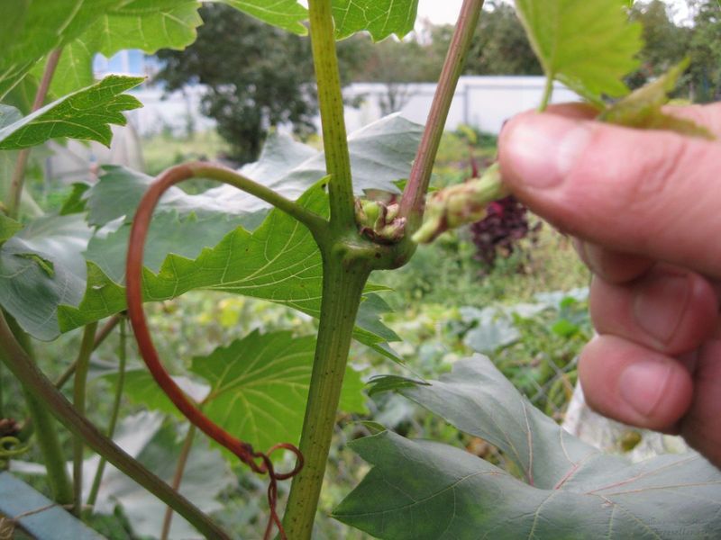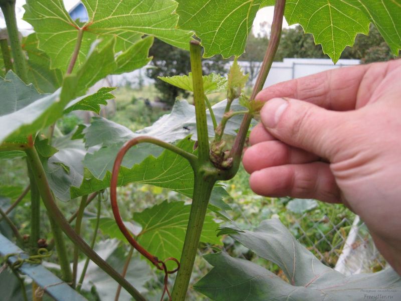 Во-вторых, необходимо также регулярно (примерно раз в неделю), выламывать побеги-пасынки, которые во множестве начинают расти в пазухах листьев, особенно после прищипки (то есть обрезания) лоз. Эти побеги не только затеняют виноградный куст, но и отбирают питательные вещества у созревающих кистей и ягод.