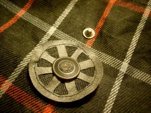 Дорожные и хозяйственные сумки часто бывают складными. В сложенном виде они застёгиваются на кнопки для компактности. Вот эти-то кнопки и станут креплениями для нашего несложного декора, когда сумка развёрнута. То есть, украшения наши съёмные. Мы изготовим их из обрезков дерматина двух видов - мягкого (серого цвета) и плотного двухслойного (на чёрной тканной основе). Нам понадобятся также разборная кнопка подходящего размера, нитки, чертёжные и швейные принадлежности.