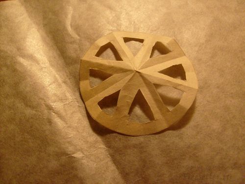 Сгибаем его в несколько сложений и вырезаем из него подобие с детства всем знакомой бумажной снежинки.