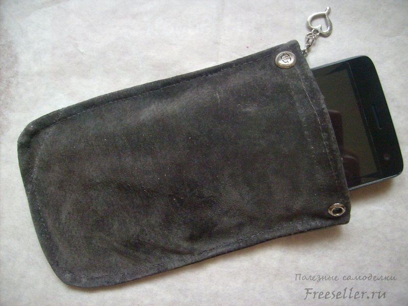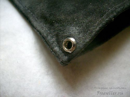 8. По разметке устанавливаем в верхнем правом углу передней части чехла люверс. Он нужен для крепления съёмного наручного ремня - чтобы телефон в чехле можно было носить на запястье. Как смастерить такой ремень, расскажем в следующей заметке.