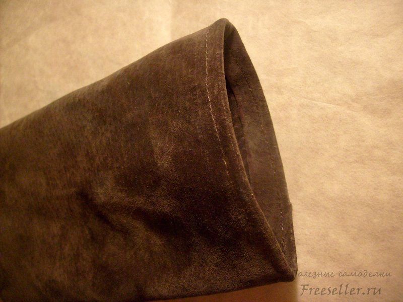 4. Выворачиваем изделие на лицо. Подворачиваем верхний край вовнутрь примерно на 1,5 см и прострачиваем по кругу.