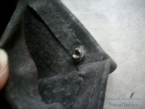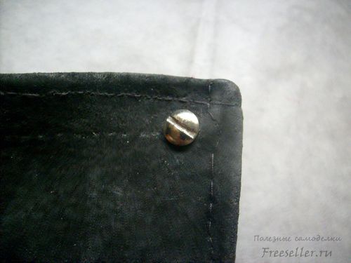 7. Головку винтового крепления по разметке вставляем в верхнем левом углу передней части чехла.