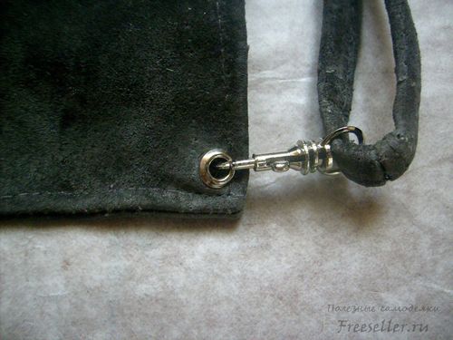 Ремешок мы сошьём для уже готового чехла - Шьём простой замшевый чехол для телефона. Используем для его изготовления ту же самую замшу. Кроме неё, нам понадобятся маленький карабин, заклёпка, нитки и швейные принадлежности.