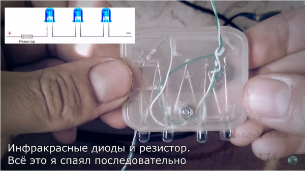 4 Ик-диода я подключил последовательно + резистор, всё это запитал на 9V. Диоды спрятал в маленькую коробочку.