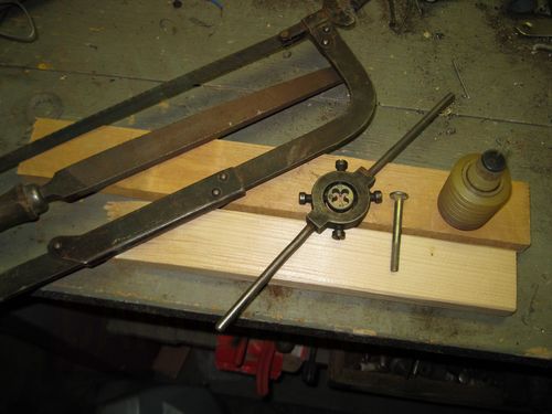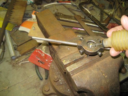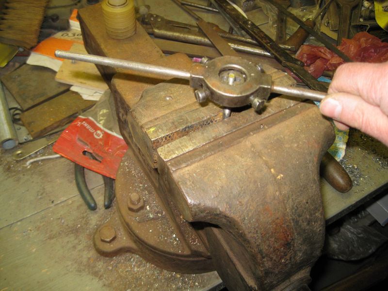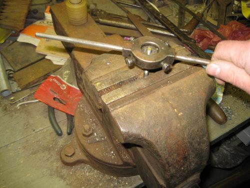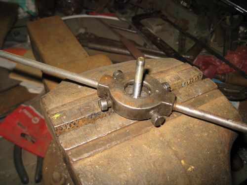 Теперь с помощью плашки, нарезаем (точнее - дорезаем) резьбу на всей выступающей из тисков части болта.