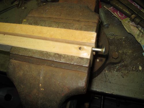 Но предварительно, чтобы не испортить резьбу, помещаем мебельный болт между двух небольших дощечек, головкой наружу, и в таком виде зажимаем в тисках.