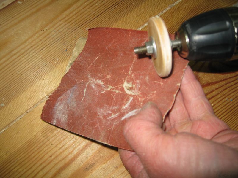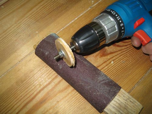 Затем вставляем хвостовик оправки в патрон дрели, зажимаем и обрабатываем нашу фанерную шайбу, допустим, при помощи крупнозернистой наждачной бумаги.