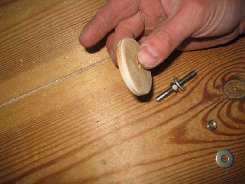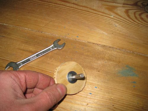 Надеваем фанерную шайбу на оправку и зажимаем ее между двух гаек с шайбами при помощи гаечного ключа на 10 мм.