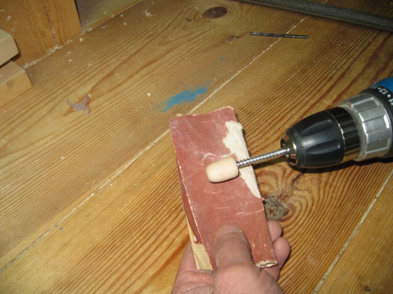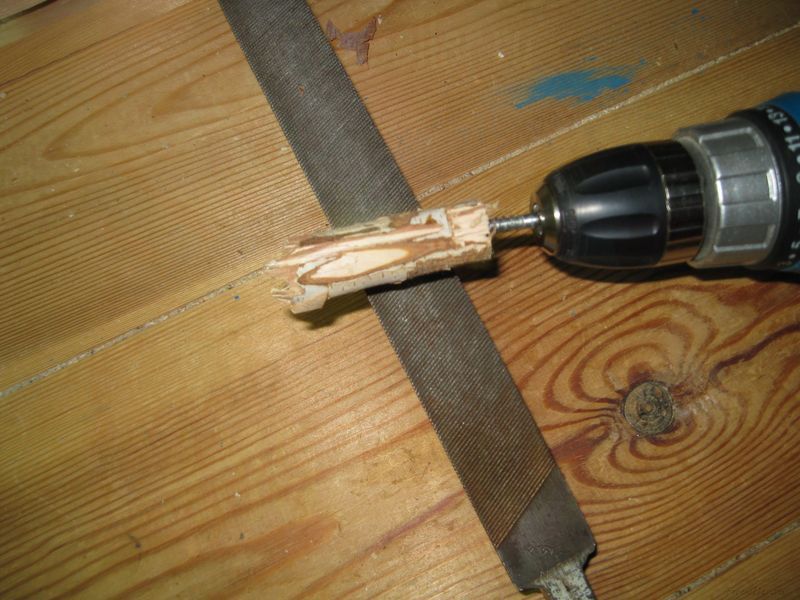 Затем накрутим этот шпенек на оправку диаметром 6 мм, зажатую в патроне дрели и для начала, попробуем обработать его напильником по дереву.