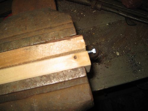 Предварительно, чтобы не испортить резьбу, помещаем шуруп между двух небольших дощечек, головкой наружу, и в таком виде зажимаем в тисках.