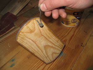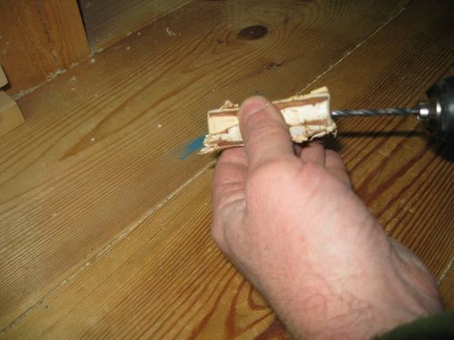 Для этого возьмем шпенек, представляющий собой отрезок березового сучка, и просверлим в нем по центру, глухое отверстие сверлом диаметром 4 мм, на глубину 20-30 мм.