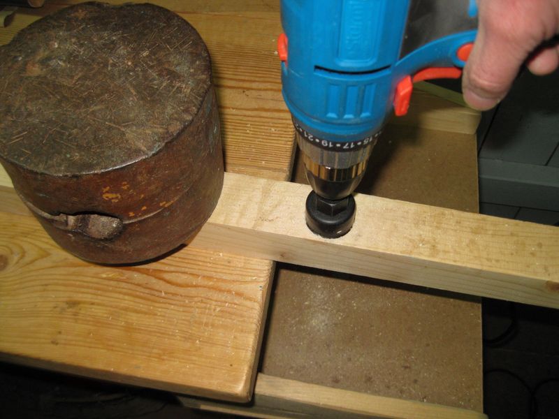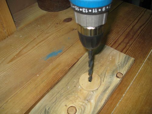 Затем рассверливаем сквозное отверстие от сверла кольцевой пилы, сверлом диаметром 8 мм, для того, чтобы нашу вешалку можно было одеть на шпильку стойки универсальной подставки.
