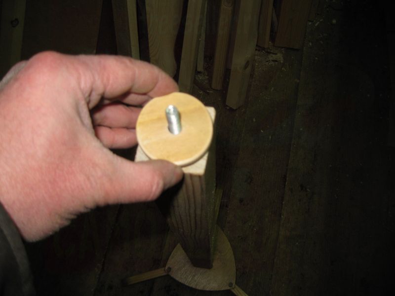 Для этого, снимаем с подставки столик и сначала устанавливаем на шпильку стойки фанерную гайку.