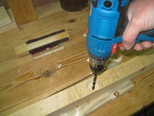 Сначала кольцевой пилой, пропиливаем в центре бруска глухое отверстие, глубиной примерно 2,5-3 см.
