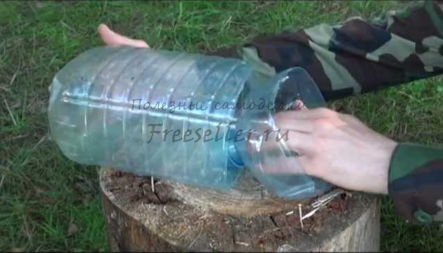 Для нашей ловушки нужна баклашка из под воды или пластиковая канистра с толстым горлышком. Далее отрезаем верхнюю часть баклашки и вставляем наоборот.
