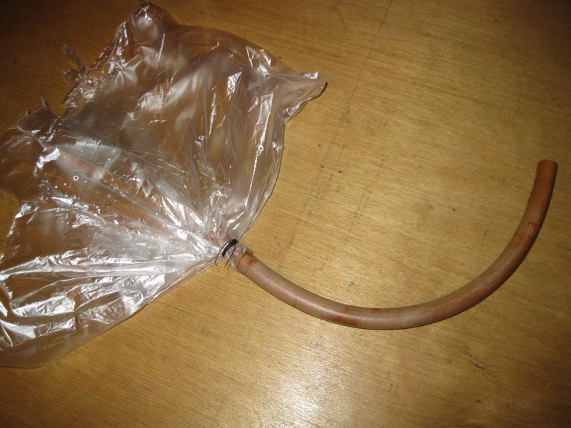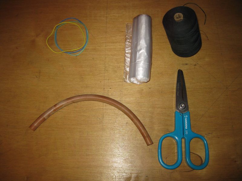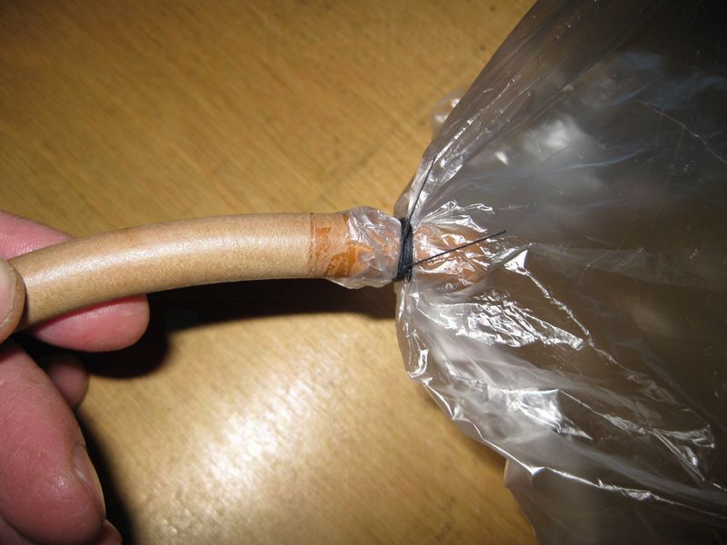 Причем обмотку нитками нужно производить достаточно плотно, чтобы в итоге резиновая трубка в этом месте немного сжалась, для обеспечения герметичности. Кончик резиновой трубки, выступающий из пакета, должен быть в пределах 15-20 мм.
