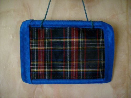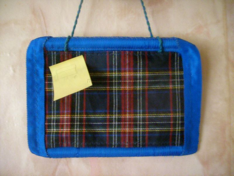 Записки, квитанции к оплате, справки, даже деньги к такой матерчатой доске объявлений крепить очень удобно - булавкой, скрепкой, да и листочки блокнота с клейким краем приклеиваются к ней легко. Для изготовления панно нам потребовались двухслойная сумочная ткань, стропа шириной 2,5 см, две трубочки длиной по 20 см, пряжа для плетения шнура (или готовый), нитки, швейные принадлежности.