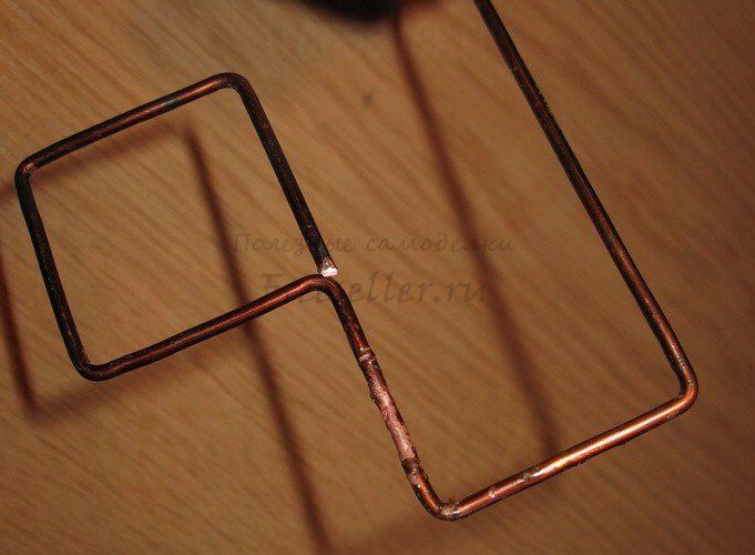 Начнем с резонатора. Для него тебе потребуется медная проволока диаметром 1.5-3 мм. Ее ты можешь достать где угодно, ибо в наше время это совсем не дефицит. Кроме нее тебе могут пригодиться молоток, пассатижи, паяльник, припой, линейка, канифоль или паяльный флюс, желательно ЛТИ-120, и руки, растущие из нужных мест. Надеемся, ты достаточно хорошо усвоил школьный курс геометрии и знаешь, как должен выглядеть квадрат. Сначала мы берем кусок проволоки длиной 244 мм и размечаем его через каждые 30.5 мм. Затем ты должен взять плоскогубцы и изгибать проволоку под углом в 90 градусов на каждой засечке. Следи, чтобы отклонения в разные стороны были минимальны и проволока не перегибалась никуда в другую сторону. Для простоты смотри чертеж.
