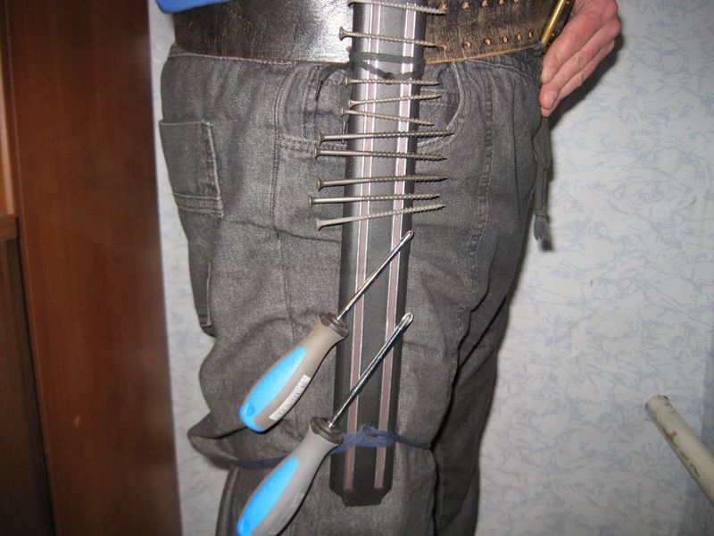 Во-вторых, должен отметить, что намного удобнее использовать сразу два подобных держателя. Один можно повесить на правое бедро, а второй на левое. При этом инструмент можно будет вешать на правый держатель (под правую руку), а крепеж на левый держатель, соответственно, под левую руку. Хотя, тут конечно все зависит от того, кто вы - правша или левша.