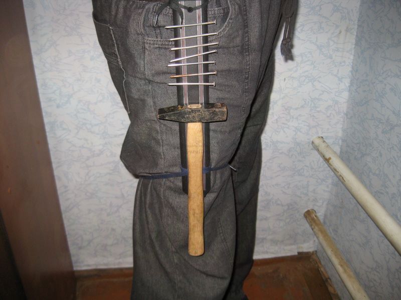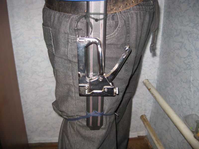 Например, крепление верхнего конца держателя к ремню, можно сделать более простым и надежным, если использовать небольшой болт с гайкой. А для крепления нижнего конца держателя к бедру, вместо шнурка можно использовать ремешок с липучкой.