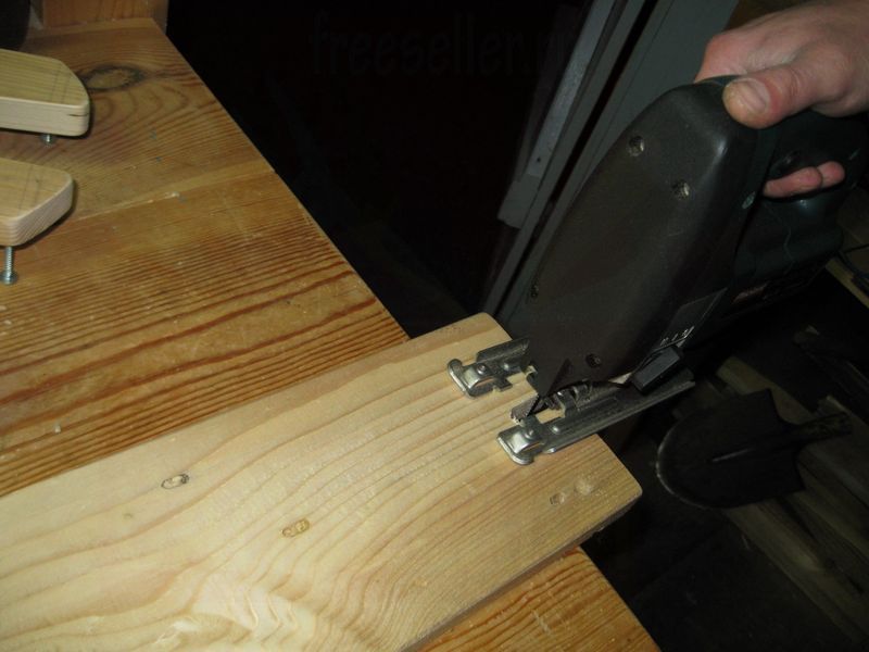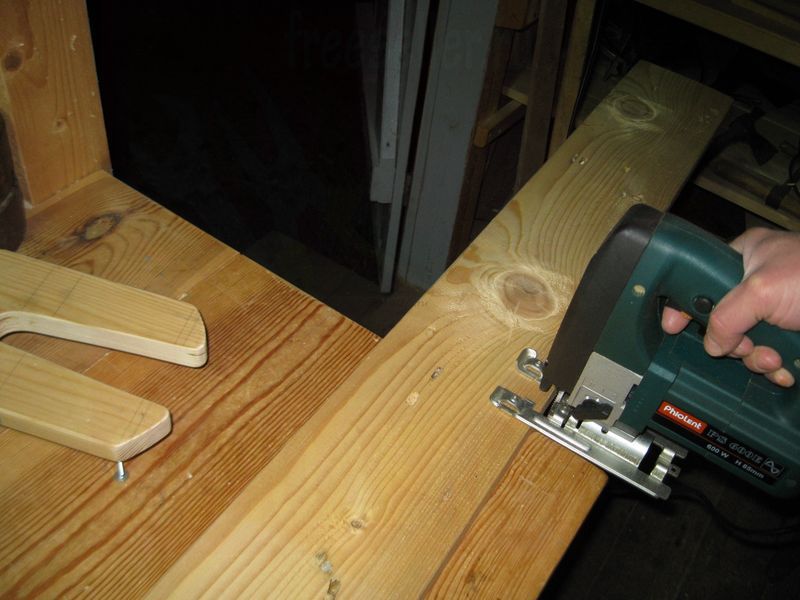 Сначала я распилил лобзиком доску на две части длиной 120 см, и 70 см, (по длине и ширине кушетки). Доску кстати, я взял не очень хорошего качества с древоточинами, но в принципе такой вполне достаточно.