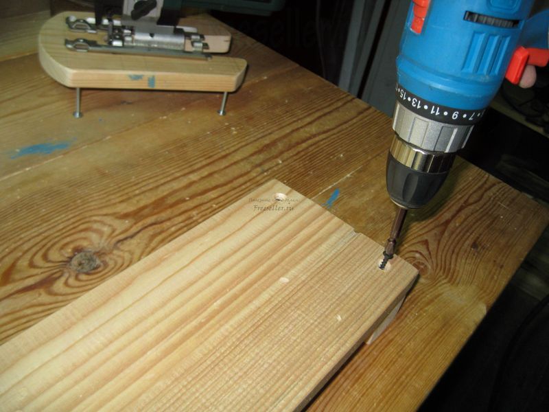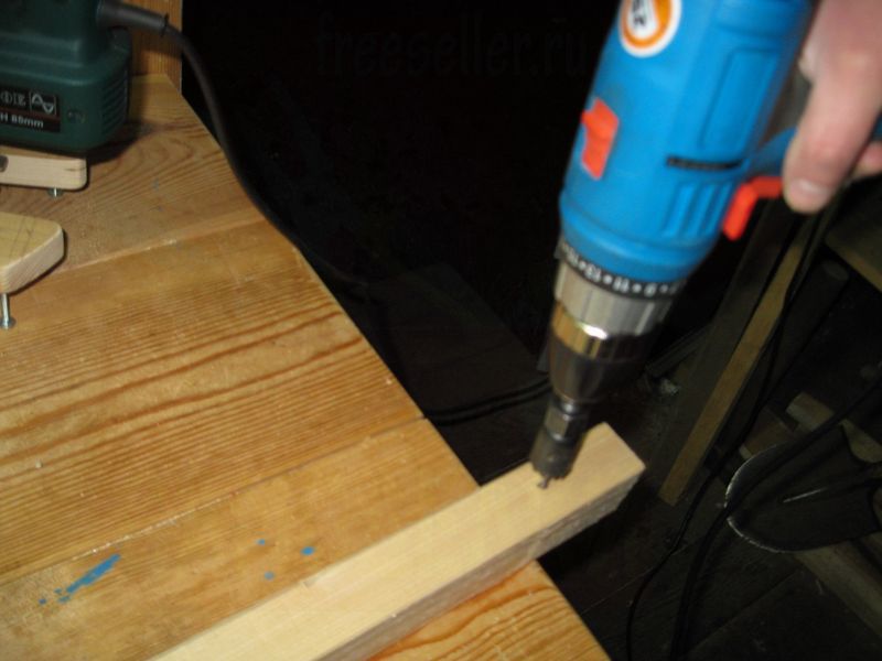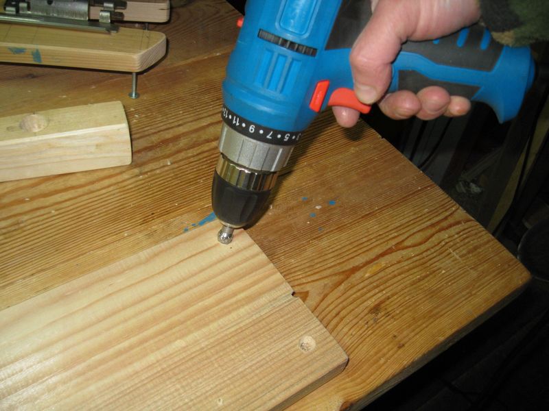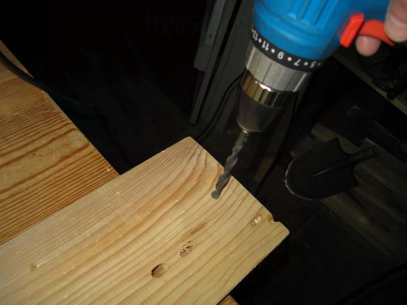 После этого я просверлил на конце длинной доски два отверстия под шурупы, используя сверло диаметром 4 мм.