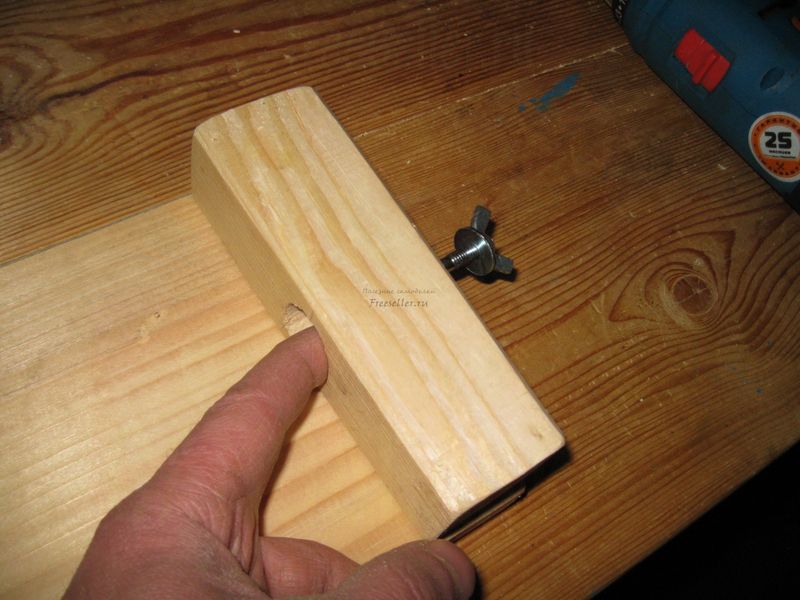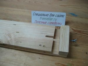 После этого прикрутил брусок с отверстием под мебельный болт, к длинной доске с помощью двух шурупов по дереву.