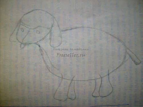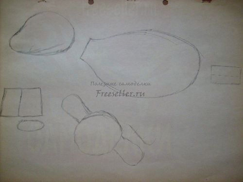 Строим выкройку деталей - по 2 половинки головы и туловища, накладка на голову с цельнокроенными половинками ушей, 2 уха, 4 прямоугольные детали ног со сгибом, 4 овальные донышка для ног, 1 деталь хвоста со сгибом.