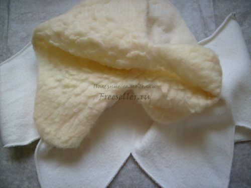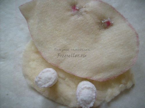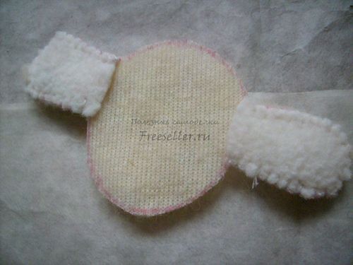 3. Сшиваем флисовые детали ушей с меховыми. Все швы выполняем по лицевой стороне, попутно обмётывая срезы.