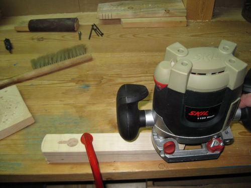 Затем я решил еще снять фаски на пазах. Для этого я использовал фрезер с остроконечной торцевой фрезой, прижав держатель к верстаку при помощи струбцины.