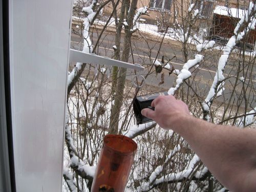Обычно на зиму, мы всегда вешаем кормушку за окно перед форточкой, чтобы удобно было насыпать в нее мелкий корм. При этом сама кормушка вешается на специальное крепление.