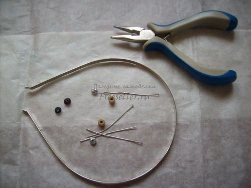 Кроме самого ободка, нам понадобились бижутерные гвоздики, бусины разного размера и фактуры. Работать будем пассатижами. Дизайн можно придумать заранее. Мы же выбрали самый простой его вариант.