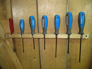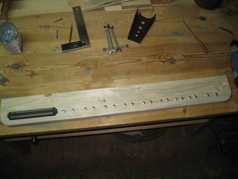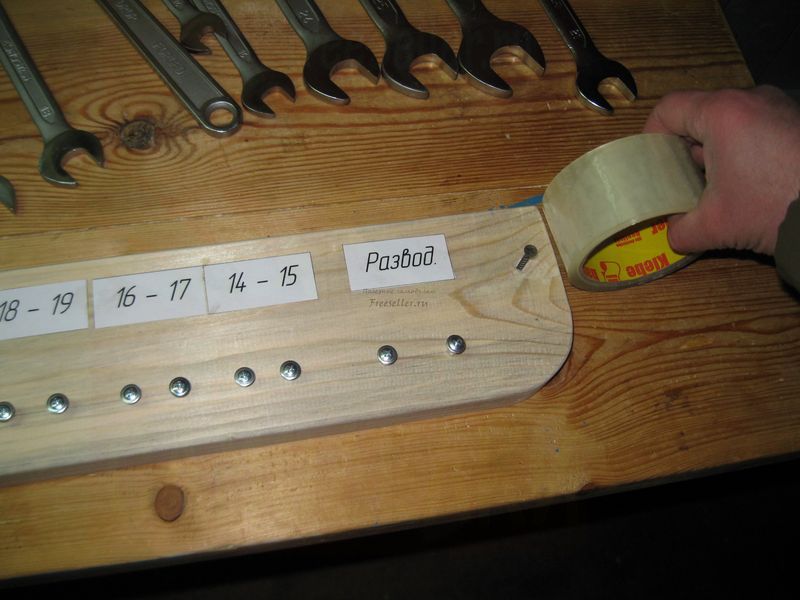 Аналогично делаем и для всех других ключей (не забывая измерять ширину рукоятки каждого ключа и выбирать по ней расстояние между шурупами), включая и разводной ключ.