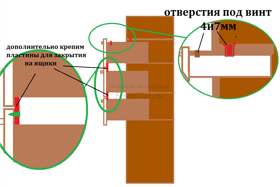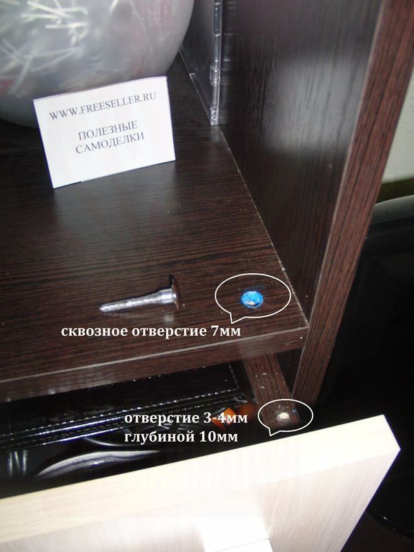 Просверливаем сквозное отверстие на 7 мм как на фото. А в самом ящике отверстие на 3-4мм и глубиной примерно 10 мм.
