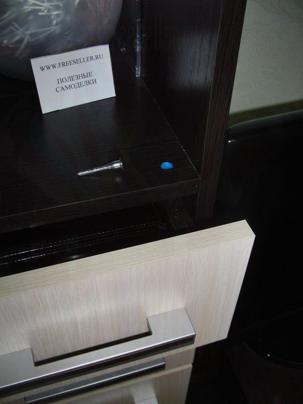 Внешне ничего не заметно - заглушка не выделяется на общем фоне. И если не знать секрет, то не сразу догадаешься. Такой "замок" можно сделать не только на ящики, но и на дверцы!