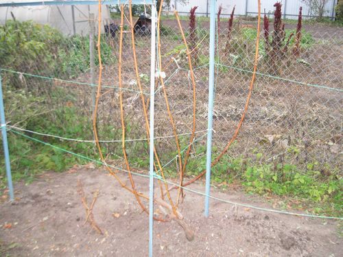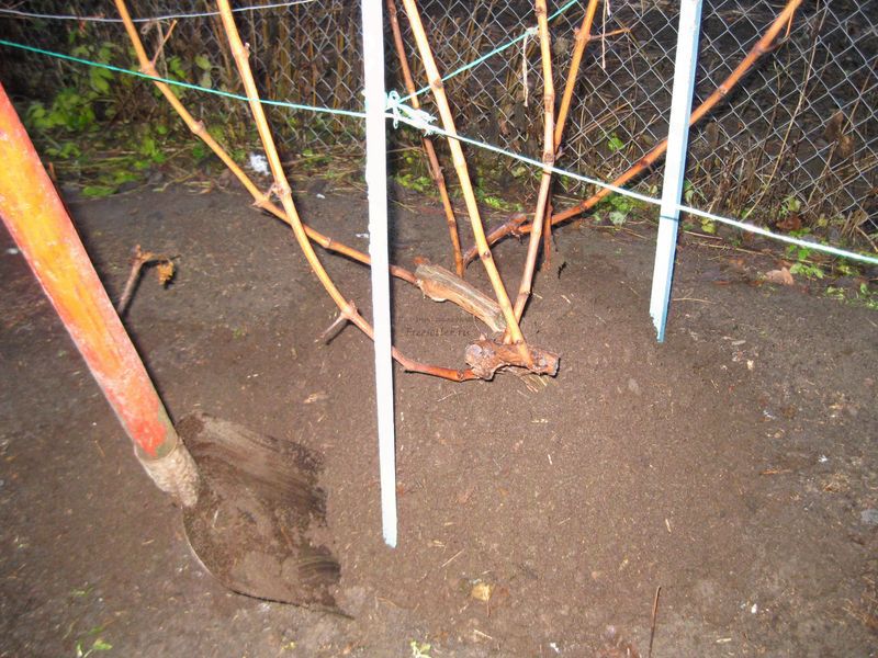 Как видно, я оставил на нем семь наиболее удачно растущих вертикальных лоз у самого основания куста. Из этих лоз в следующем году, весной, я выберу наиболее подходящие и привяжу их горизонтально к колышкам. Как раз из них, и будут расти новые вертикальные лозы, на которых собственно и будет формироваться урожай следующего года.