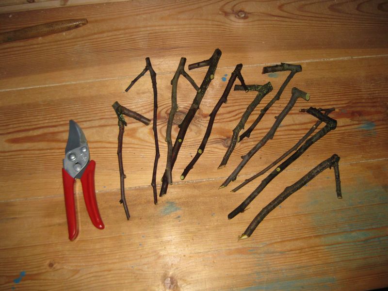 Такие крючки можно сделать из деревянных дощечек или из проволоки, но самый простой вариант, который я использую уже давно, это нарезать эти крючки секатором из различных веток, оставшихся после осенней обрезки сада.