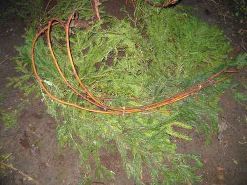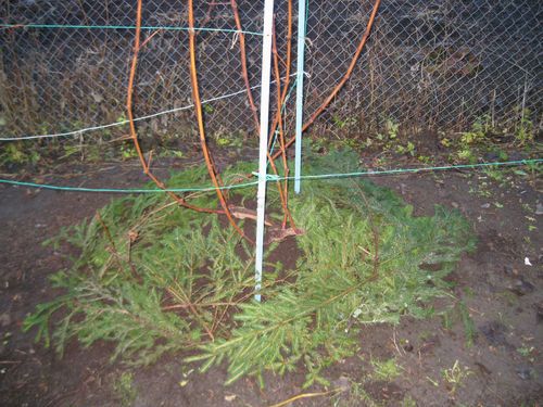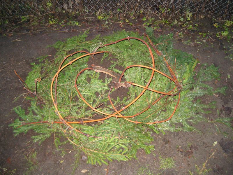 Берем несколько веток лапника и раскладываем их у основания куста. На них мы будем укладывать скрученные лозы.