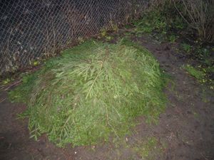 Теперь накрываем его лапником. Для этого ветви лапника раскладываем веером по окружности пушистыми концами веток наружу, а обломанными кончиками к середине куста.