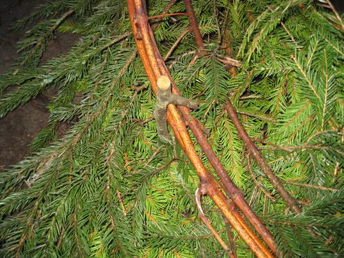 Все лозы укладываем на подложенный лапник и пришпиливаем их к земле деревянными крючками.