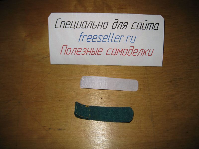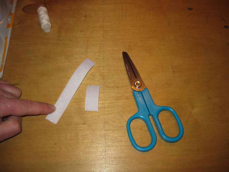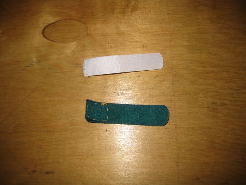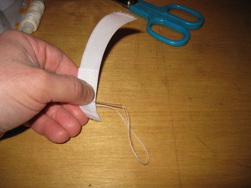 Затем прикладываем короткий кусочек липучки к одному из кончиков обратной стороны длинного куска и, взяв иголку с ниткой, сшиваем оба кусочка.