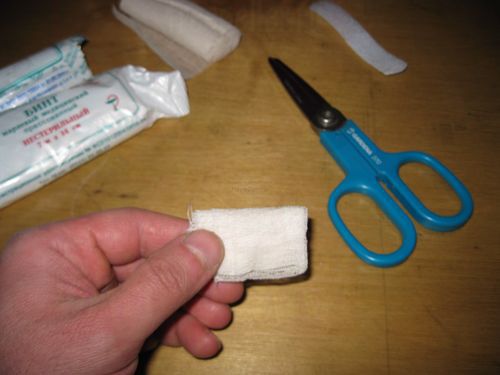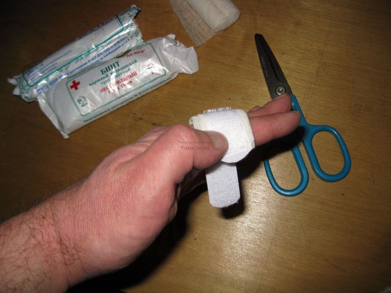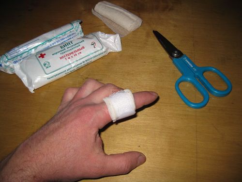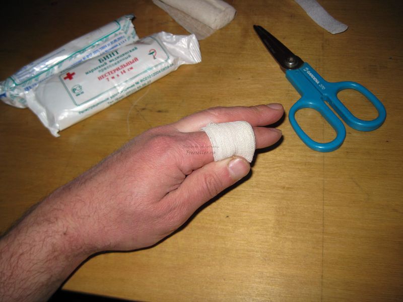 Действительно, если у вас на пальце небольшой порез, теоретически достаточно просто отрезать кусочек бинта, сантиметров двадцать длиной, сложить его в несколько раз и нанеся на него какой-либо антисептик, приложить непосредственно к порезу.