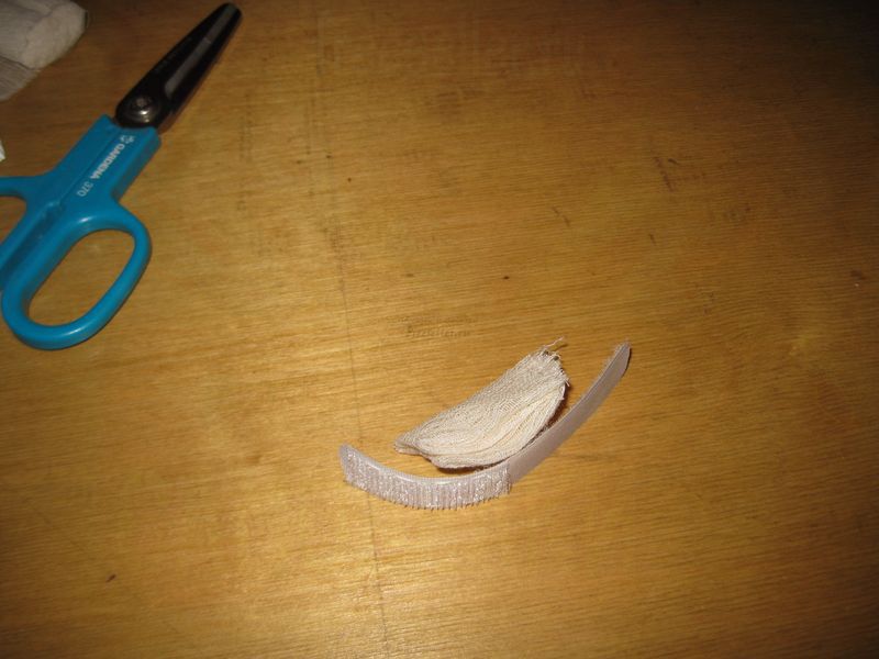 Сначала ножницами отрезаем от ленты-липучки два кусочка. Естественно, что каждый из них должен быть от разной ленты, один от ленты с петельками, а другой от ленты с крючками. Первый кусок должен быть длиной примерно около 10 сантиметров (он и будет непосредственно исполнять роль повязки), а второй длиной 3-4 см, будет исполнять роль застежки.