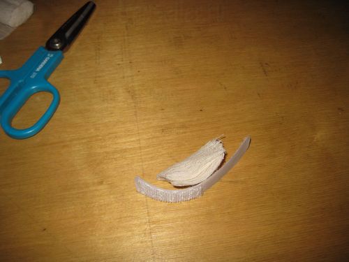 После этого обрезаем ножницами острые уголки на концах нашей повязки, заодно несколько скругляя их.