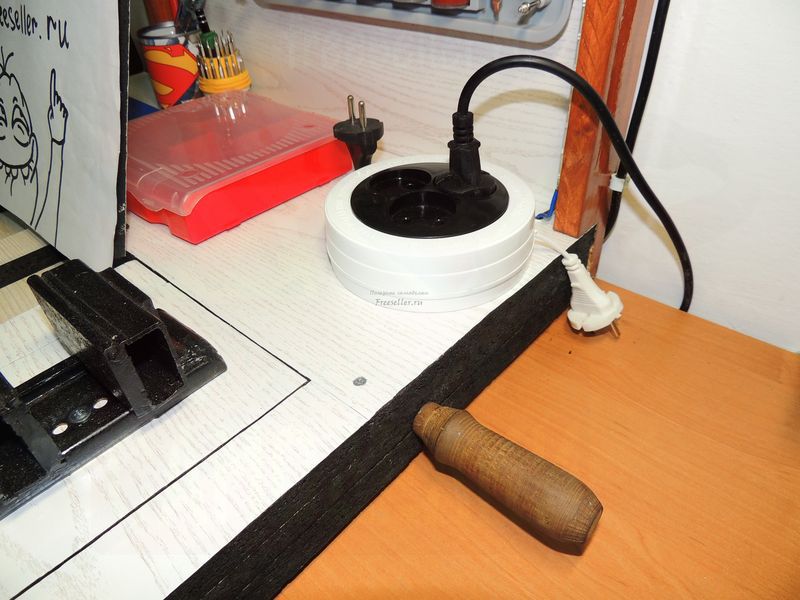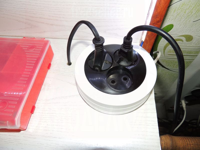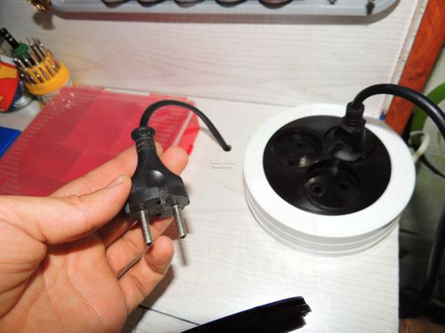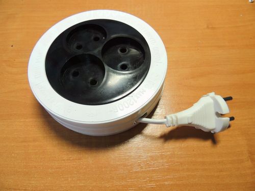 Установил вот такую переноску, длина 5 метров, что более чем достаточно, удобство в том, что у нее три розетки, и она легко сматывается, при этом, не занимая много места.