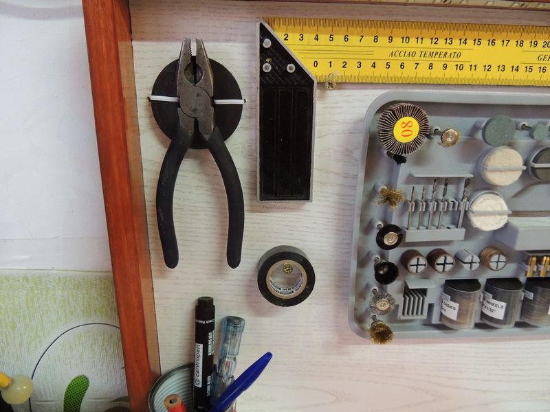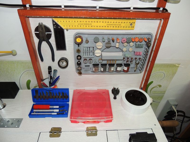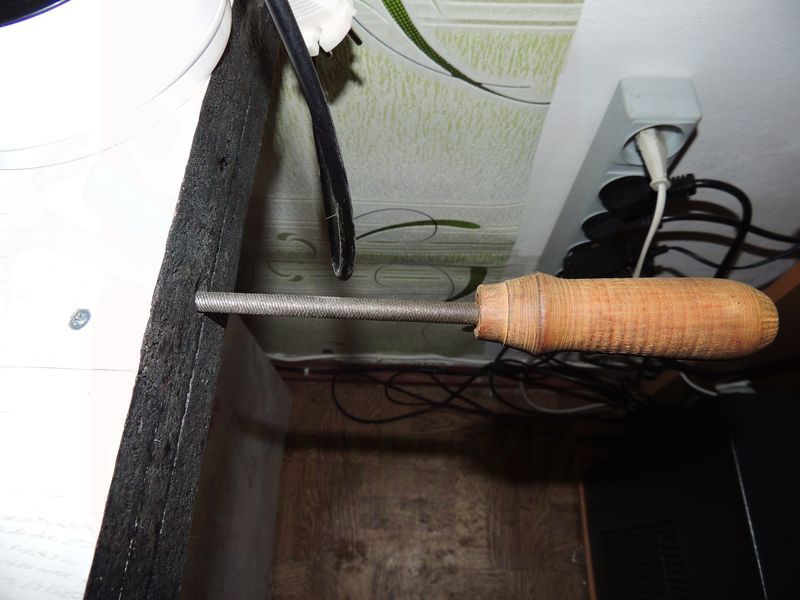 Так как напильник нужная вещь, и его не было куда пристроить, я просверлил с боку несколько отверстий, в одном из них сейчас расположен круглый напильник, так же можно еще добавить стамеску, отвертку, и т.д.